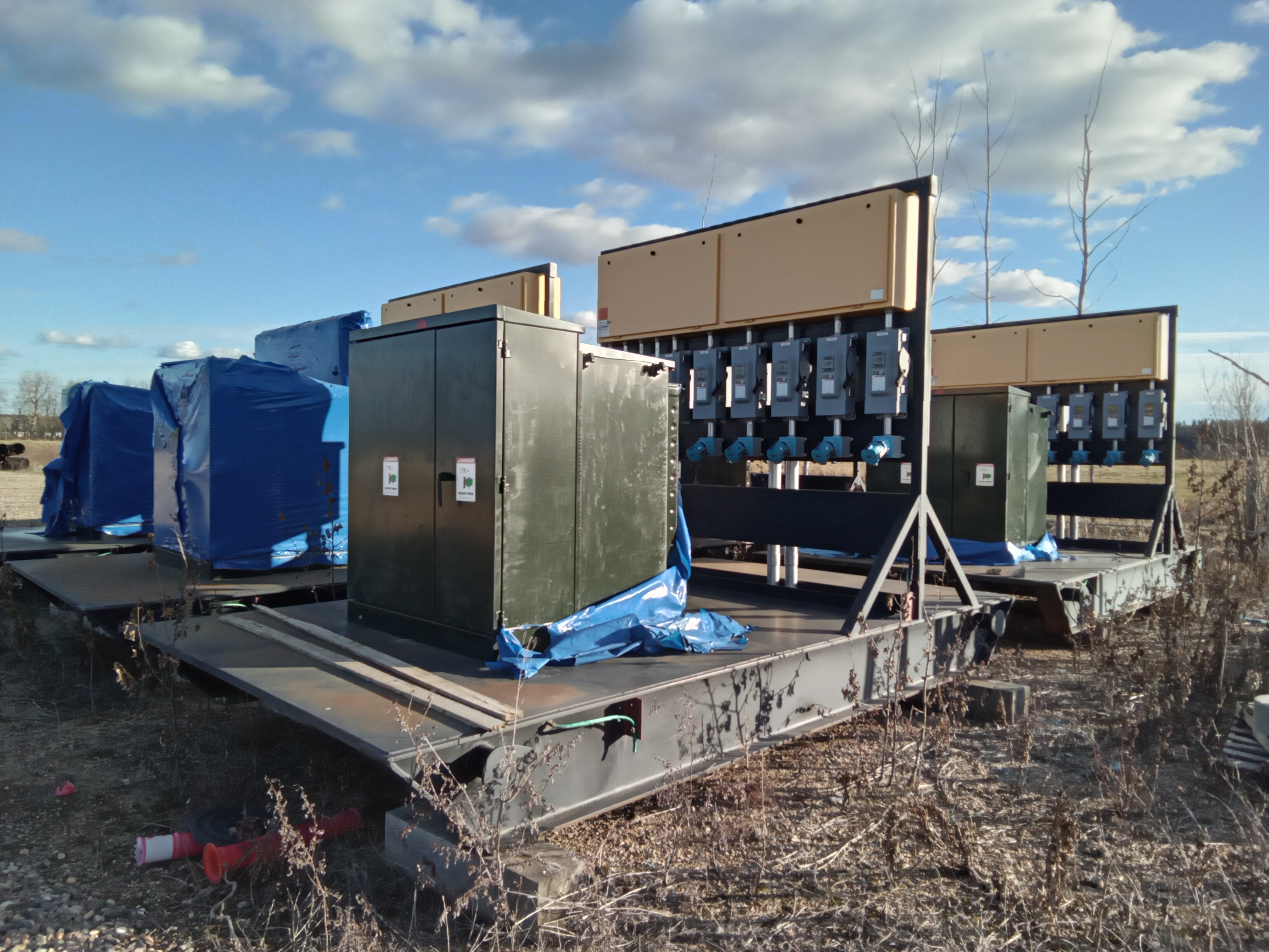 500 KVA 3 phase Transformer Skid. Skids c/w Breakers, plugs and Transformers.