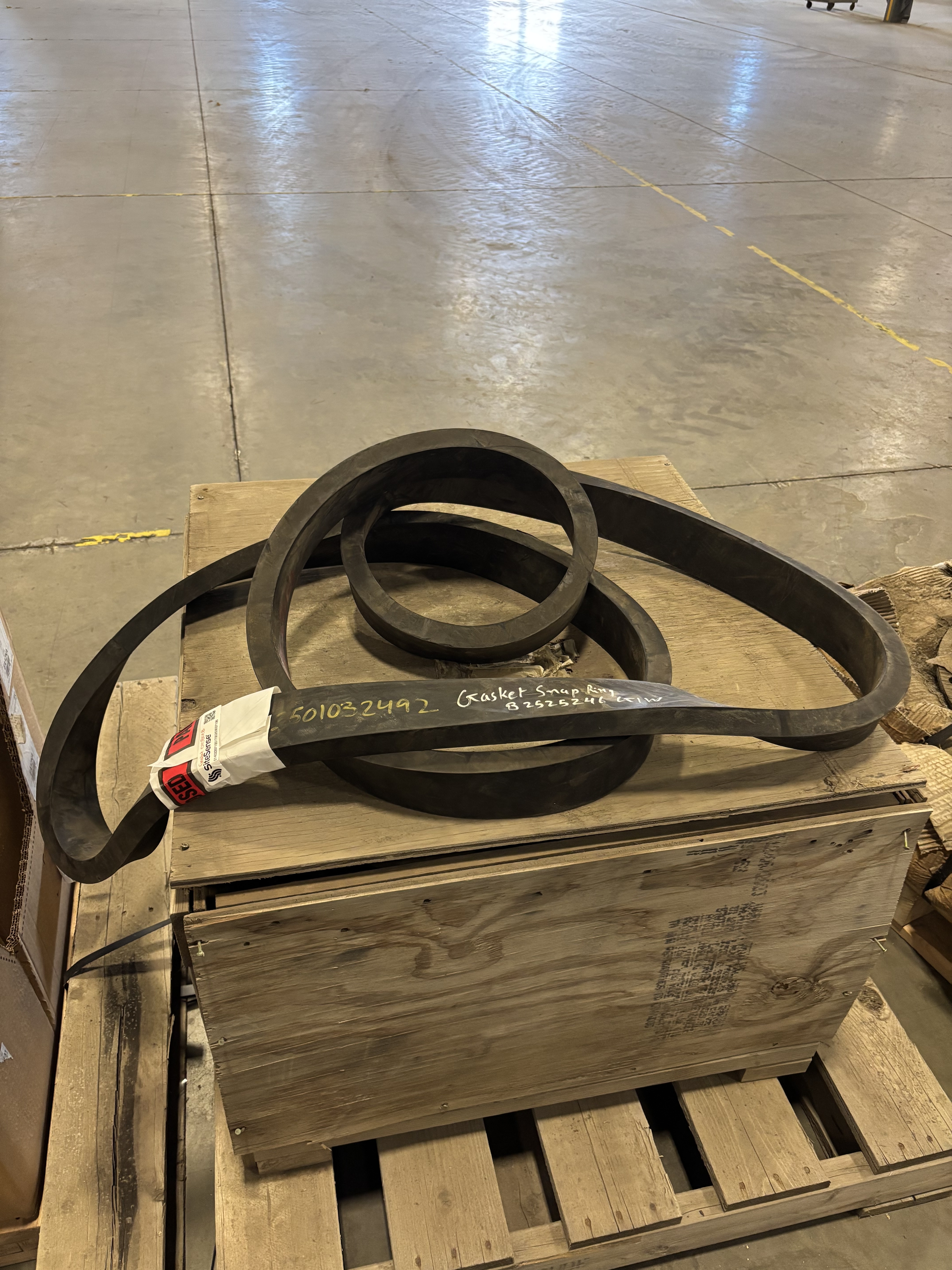 This GIW snap‑ring gasket is unused and never installed, retained as maintenance spare inventory. The gasket material is intact with no cuts, deformation, compression set, or chemical exposure. Minor surface dust and handling marks are present from warehouse storage only. Handwritten identification on the protective wrap is visible and does not affect usability.